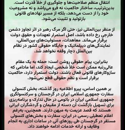 შესაბამისად, საელჩოს გუშინდელი განცხადების თანახმად, ირანის ისლამური რესპუბლიკის საელჩოს საკონსულო განყოფილება და ბათუმში ირანის ისლამური რესპუბლიკის გენერალური საკონსულო ემზადებიან საქართველოში მცხოვრები და ტურისტად მყოფი ირანის იმ მოქალაქეთა მიმართ დახმარების გასაწევად, რომლებსაც სამშობლოში დაბრუნება სურთ. ამასთან, ირანში გამოცხადებული ოფიციალური დასვენების მიუხედავად, საელჩო და საკონსულო განყოფილებები საქართველოში, მომდევნო დღეების სამუშაო საათებშიც გააგრძელებენ თავიანთი მოვალეობების შესრულებას და მომსახურების გაწევას.