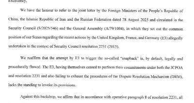 انتظار جدی جمهوری اسلامی ایران این است که دبیرکل سازمان ملل متحد و شورای امنیت، مطابق با مسئولیت خود در قبال حفظ صلح و امنیت بینالمللی، اقدامات مقتضی را با هدف تضمین پاسخگویی ایالات متحده و رژیم اسرائیل در قبال این نقضهای فاحش اتخاذ نموده و عاملان این جنایات را به دست عدالت بسپارند.