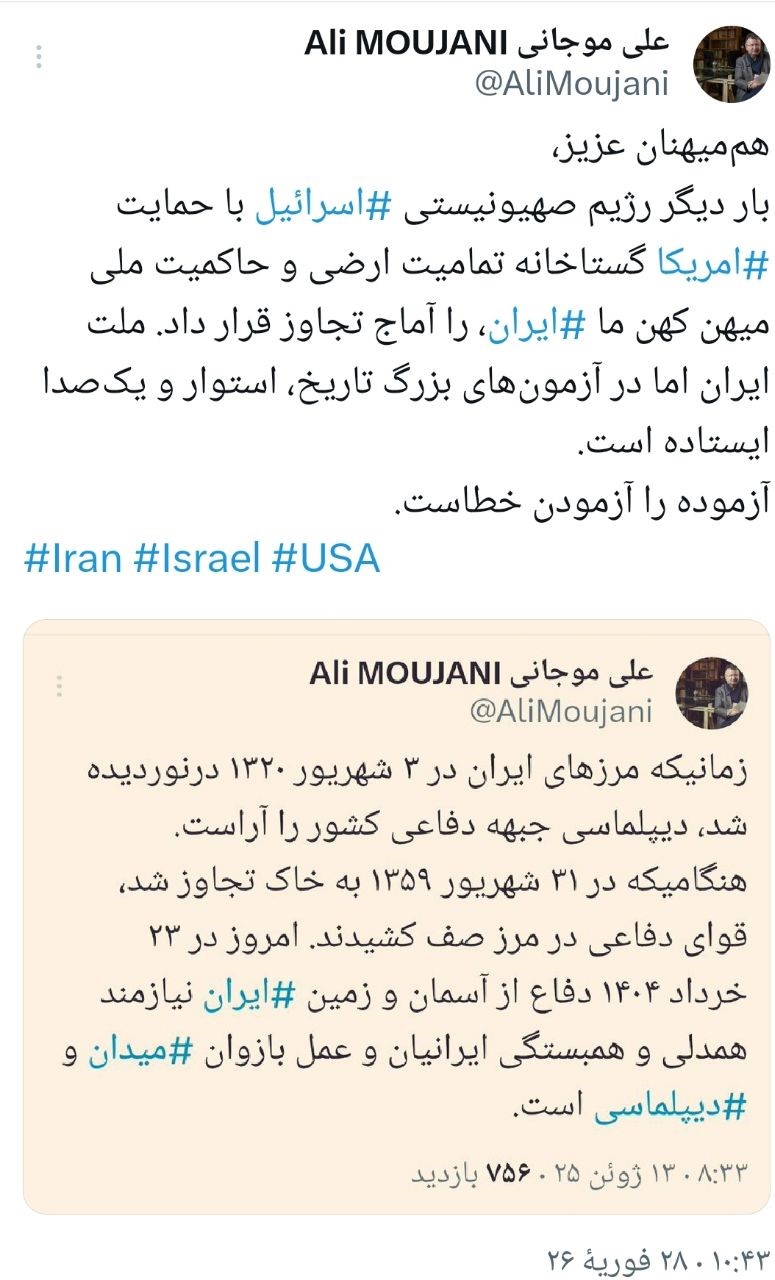 باردیگر رژؤیم صهیونیستی اسرائل با حمایت آمریکا گستاخانه تمامیت ارضی وحاکمیت ملی میهن کهن ایران را آماج تجاوز قرار داد. ملت ایران اما در آزمونهای بزرگ تاریخ استوار ویک صدا ایستاده است